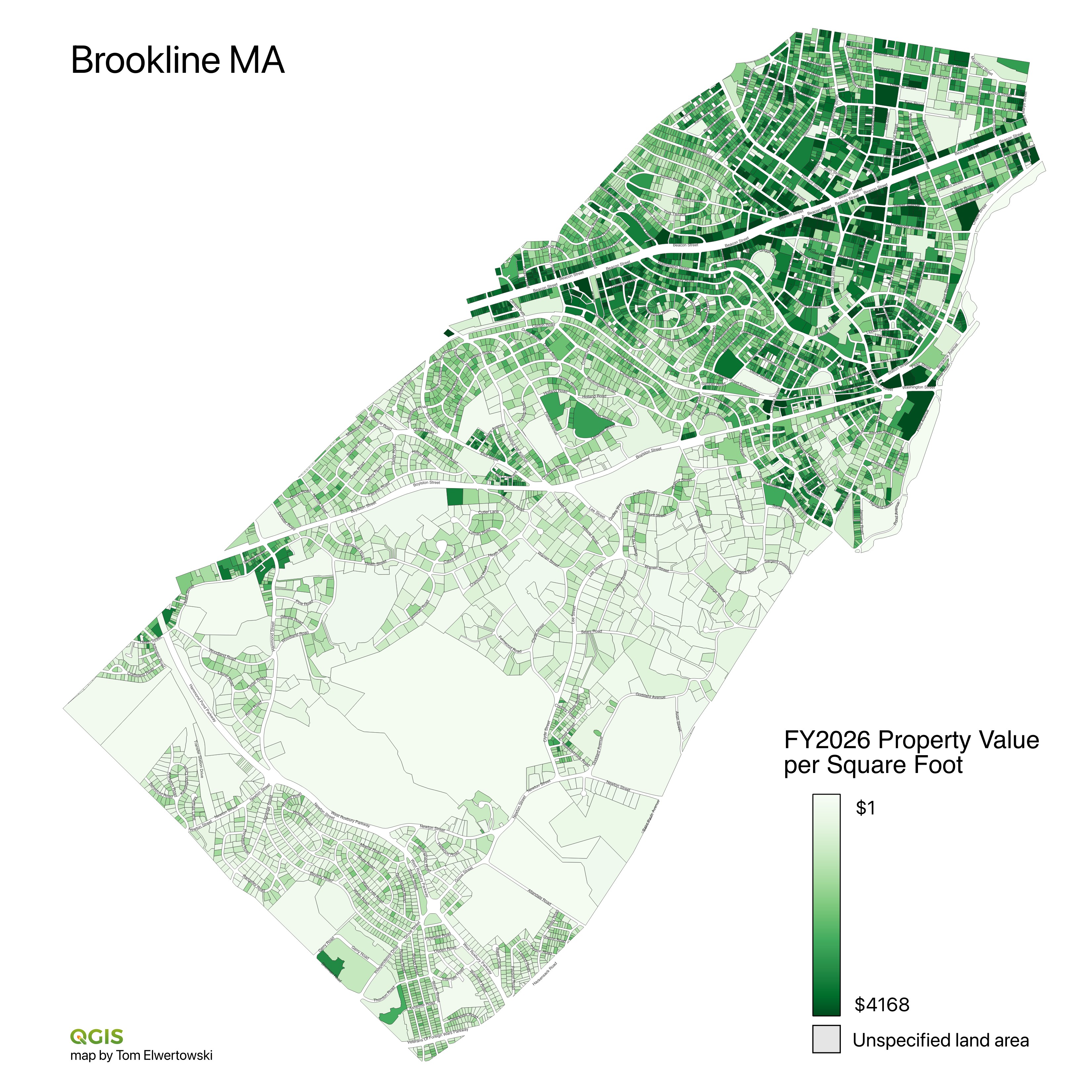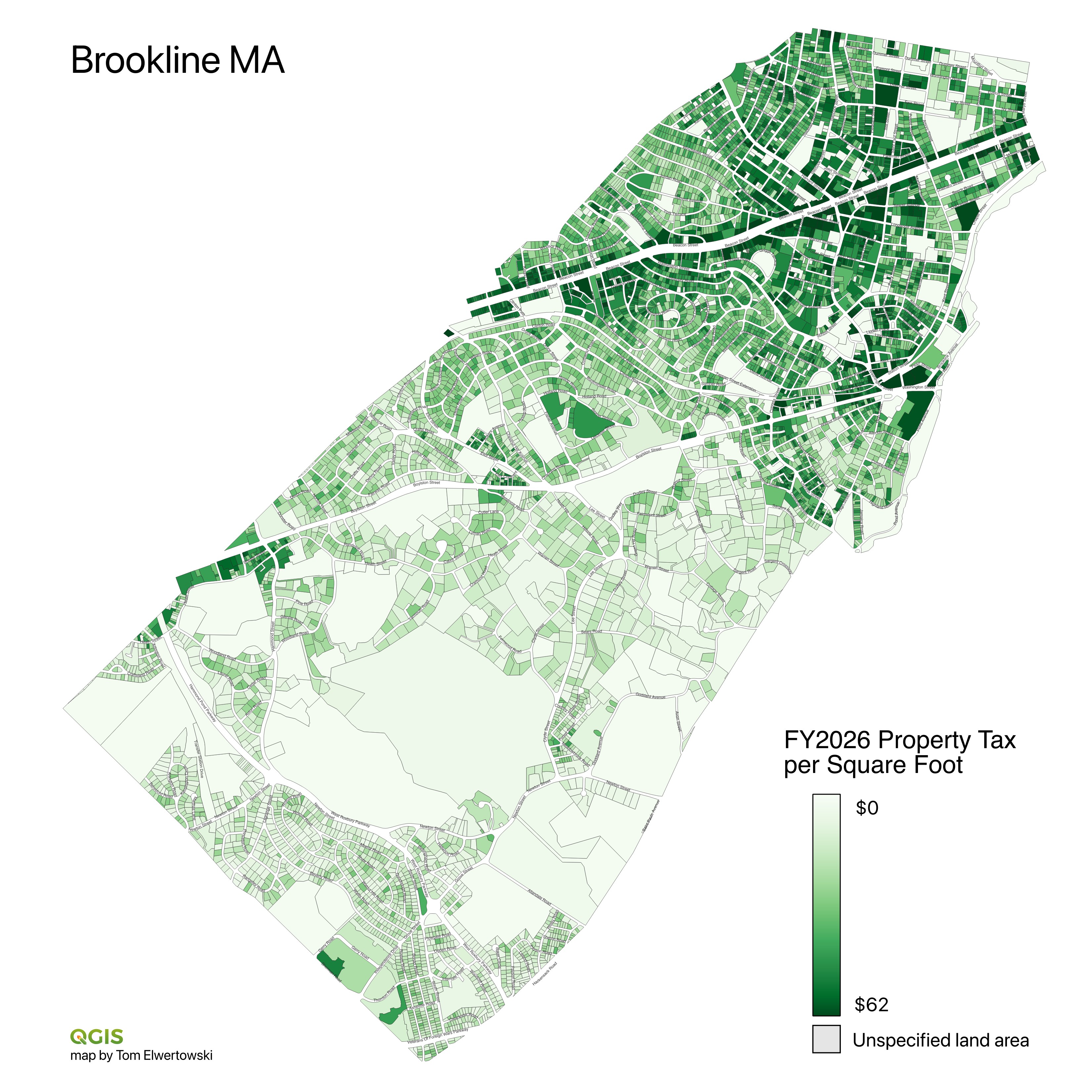 Brookline change in assessed value from FY2025 to FY2026. Total taxable property increased by 2.5%. Hover over a property to display value. Source: Brookline Assessor's annual spreadsheets.